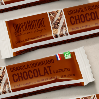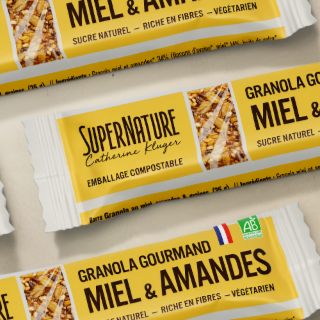 Barres Granola BIO Miel & Graines : un encas sain et gourmand, riche en avoine et graines, faible en sucre et emballé dans un packaging compostable.