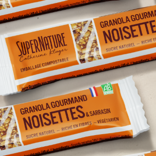 Barres Granola BIO Noisettes & Sarrasin : un encas végan, sain et croquant, faible en sucre et fabriqué en France.