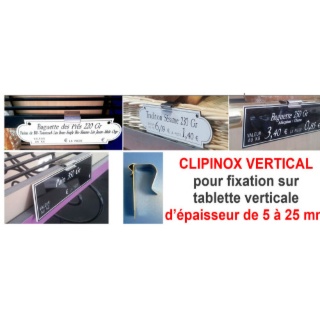 Le CLIPINOX VERTICAL Se fixe aux tubes, barres laitonnées et se clippe sur le chant des retours verticaux de panetières et des plaques verticales de vitrine. Avec le...