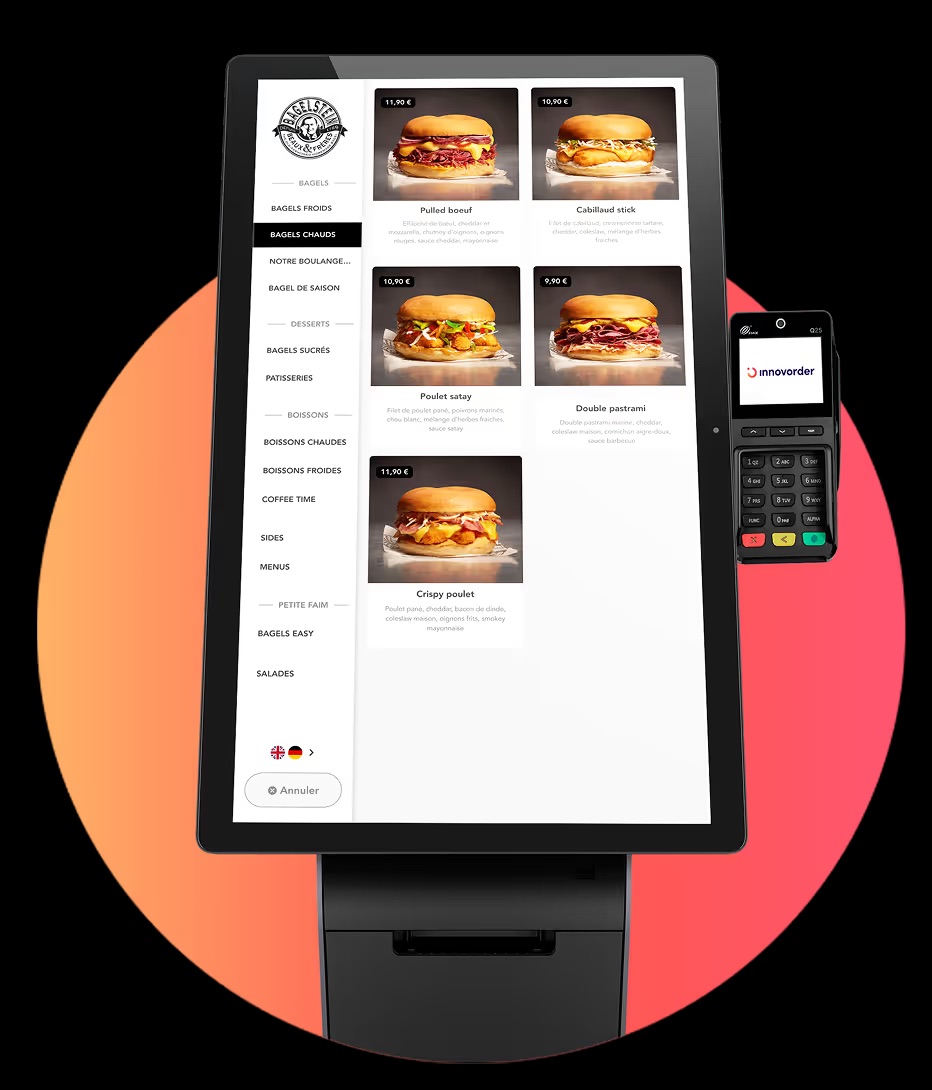 Connectée à votre caisse et à votre écran de production, elle assure un parcours de commande sans erreur, en toute autonomie. Elle prend en charge plusieurs langues et s’intègre facilement à vos outils de fidélité. Disponible en différents formats (15", 22", 27"), sur pied, murale ou comptoir, elle s’adapte à tous les espaces, même les plus restreints.