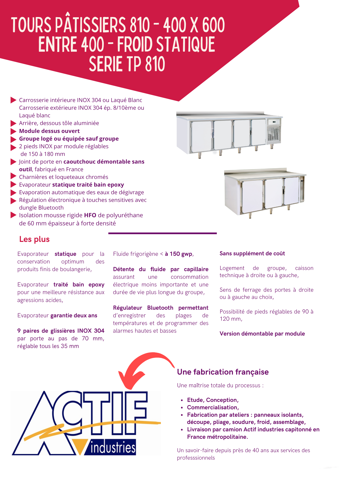 Le tour Pâtissier série TP 810 est spécialement conçu pour conserver les produits finis de pâtisserie (gâteaux, entremets, éclairs etc...), équipé d'un évaporateur statique, il assure une conservation optimale des pâtisseries. Il est disponible en finition INOX et Laqué blanc, 2 à 5 portes, groupe logé ou préparé pour groupe à distance. Il est reconnu pour sa performance frigorifique, sa durabilité et il profite de la rigueur de fabrication propre à Actif Industries.