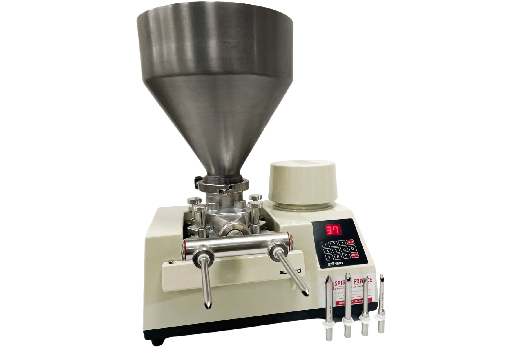 La PS4030 Pro est fournie avec une pompe à engrenages, un bol inox 9.5L et 3 jeux d’injecteurs (éclairs, choux, réductions).