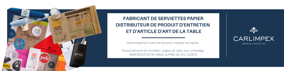 Fabricant et distributeur depuis 1953, Carlimpex est spécialisé dans les serviettes en papier, les articles d’arts de la table à usage unique ainsi que les produits d’hygiène et d’entretien destinés aux professionnels et distributeurs du secteur HORECA et collectivités? avec un large choix de matières, formats, couleurs et de solutions adaptées. Notre cœur de métier est la personnalisation, qui permet de créer des produits uniques qui reflètent parfaitement l’identité de nos clients. Depuis plus de 70 ans, Carlimpex associe expertise, qualité et réactivité au service des professionnels.