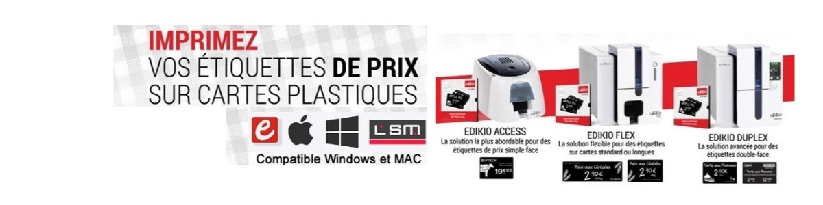 Elle fournit les gammes d’imprimantes Evolis Edikio Pricetag et Guest (access, flex et duplex). Ces offres sont dédiées à l’étiquetage des produits pour les boulangers, bouchers, traiteurs, restaurants, hôtels. Cela permet de créer et d'imprimer soi-même les étiquettes de prix sur carte PVC, en respectant les informations réglementaires (allergènes, symbole de décongélation...). Les clients apprécient le gain de temps de la gestion de leur étiquetage des prix en toute autonomie. Les solutions Edikio sont destinées à l'impression des étiquettes de prix pour les produits vendus en vrac dans le magasin.