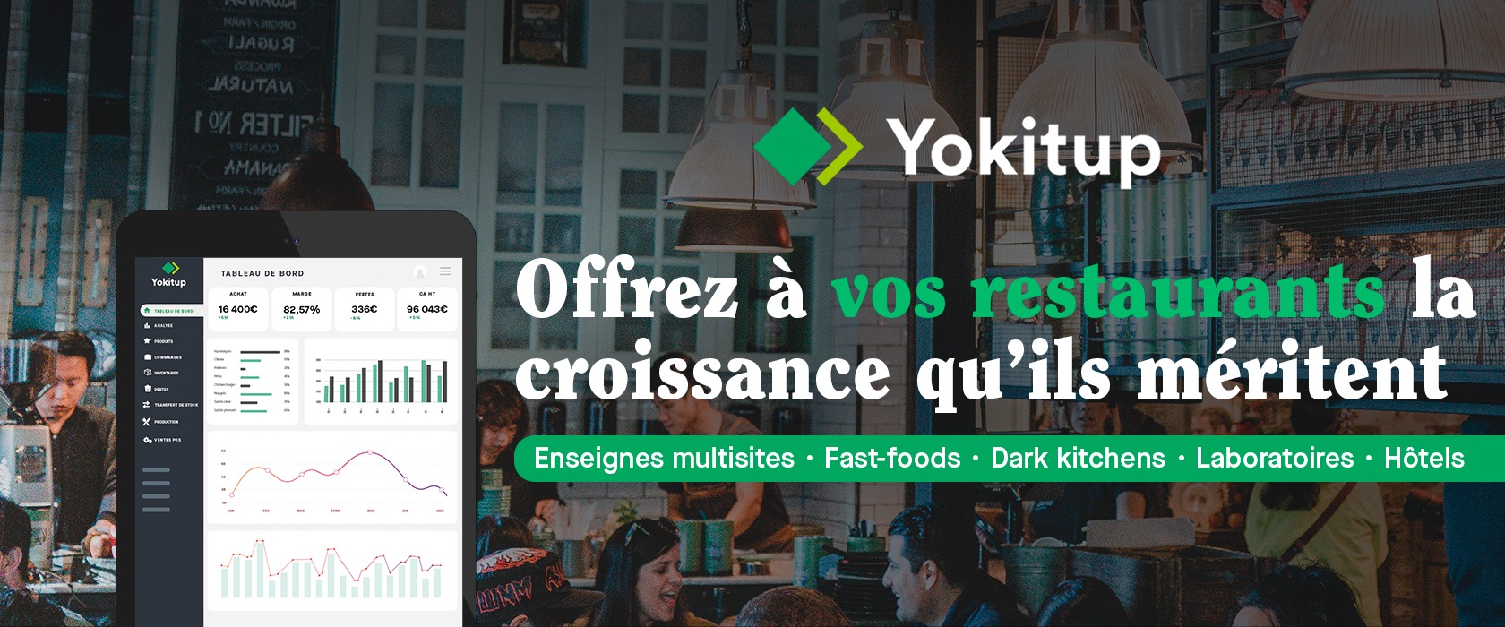 Enseignes multisites, fast foods, dark kitchens, laboratoires, hôtels ; Yokitup est le co-pilote de croissance de centaines de restaurateurs. Facilement intégrable à votre système de caisse, Yokitup permet le pilotage précis de vos stocks, l’optimisation de la chaîne opérationnelle de tous vos établissements et l’analyse de votre rentabilité.